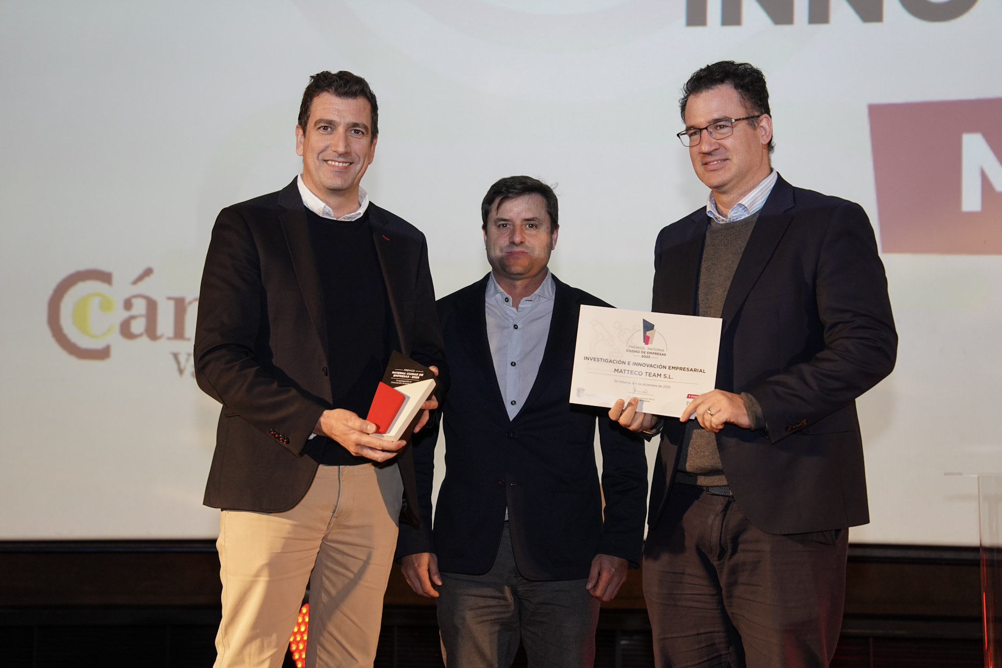 El Premio a la Mejor Empresa en Investigación e Innovación Empresarial fue concedido a MATTECO TEAM, S.L. entregado por Antonio Alagarda, presidente de la EGM Parc Tecnològic Paterna, a Iker Marcaide, CEO de la compañía, acompañado por Gonzalo Abellán Sáez, cofundador y CPO de Matteco.